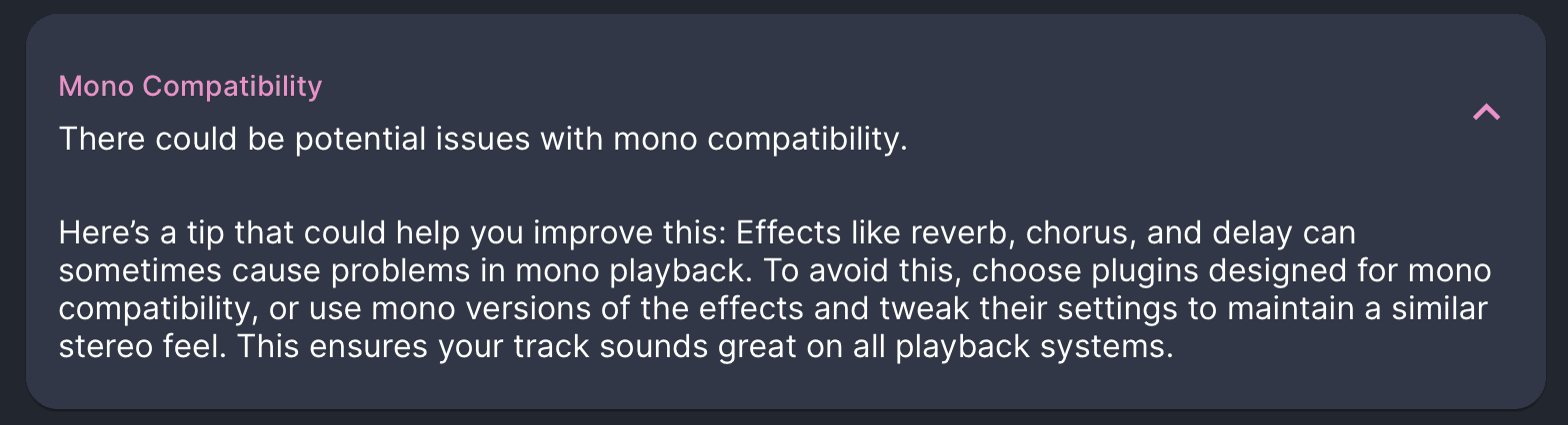 Si vous n'avez pas de mètre de corrélation, ne vous inquiétez pas. Mix Check Studio peut vérifier votre mix ou votre master pour vous et vous donner des conseils pratiques s'il est trop étroit ou susceptible de causer des problèmes de phase.
