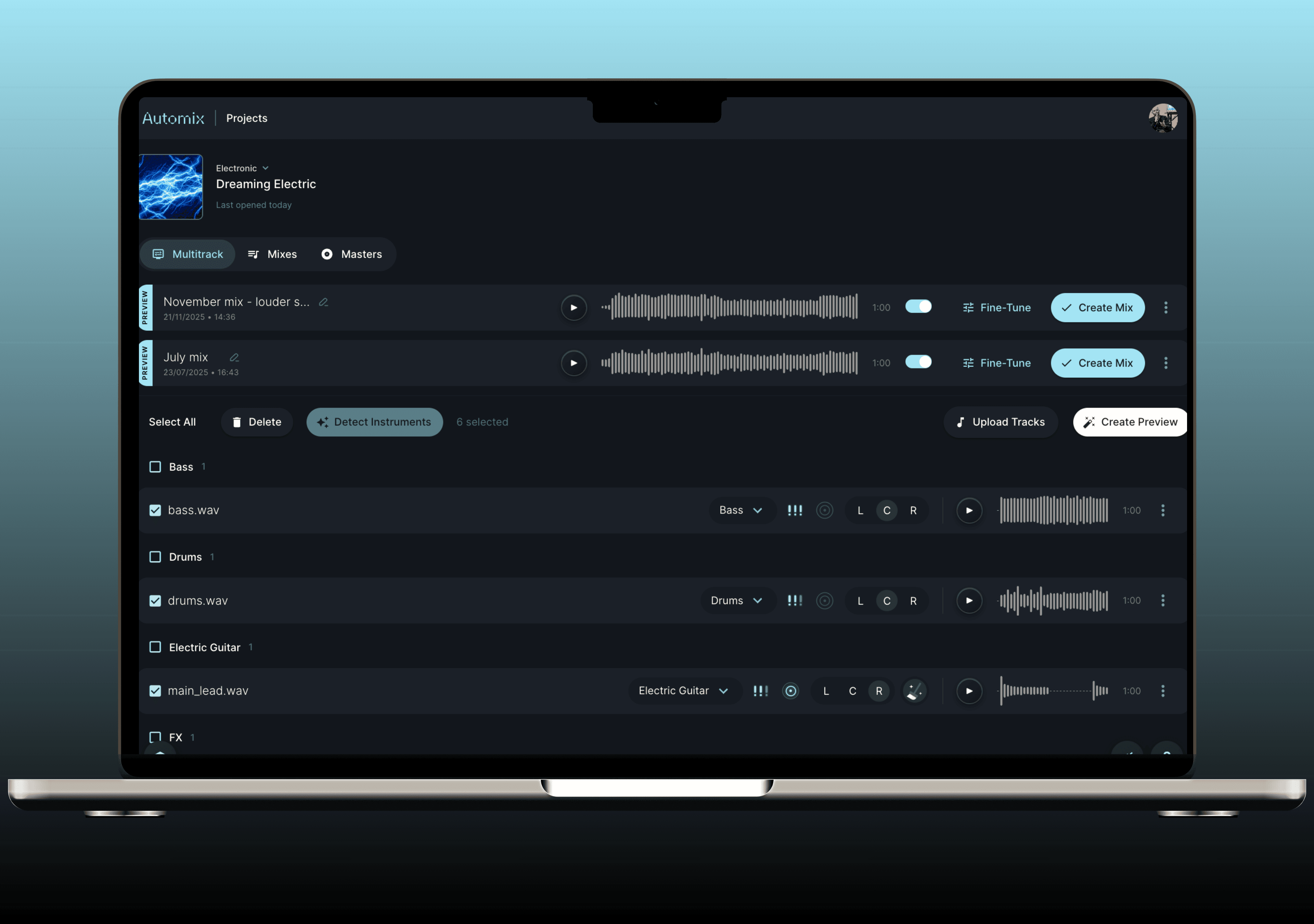 Automix 不只是混音——当混音完成后,它也会进行母带处理。母带阶段会应用最终处理,把你的曲目提升到适合发行的响度,并确保它在不同播放系统上都能良好还原,从流媒体到手机扬声器,再到俱乐部音响系统。
